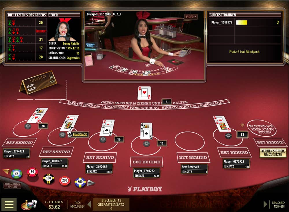 Zu den hochklassigen Features unserer Anbieter gehört zunächst die Präsentation der Live Croupiers in der Lobby. Testen Sie es, wenn Sie das nächste Mal im Casino online sind. Wetten dass Ihr Herz beim Anblick der charmanten Damen lacht, die Sie da zum Spiel laden? Mitunter sind sogar Plätze an den Playboy Tischen mit ihren hübschen Bunny Dealern frei. Obendrein lassen sich in den besten Casinos gleich mehrere Tische öffnen: Im Menü am unteren Rand befindet sich ein Button, der Sie zurück in die Lobby führt. Dort können Sie weitere Tische fürs Simultanspielen auswählen und Sie müssen sich nicht einmal ausschließlich auf Live Dealer Blackjack beschränken.